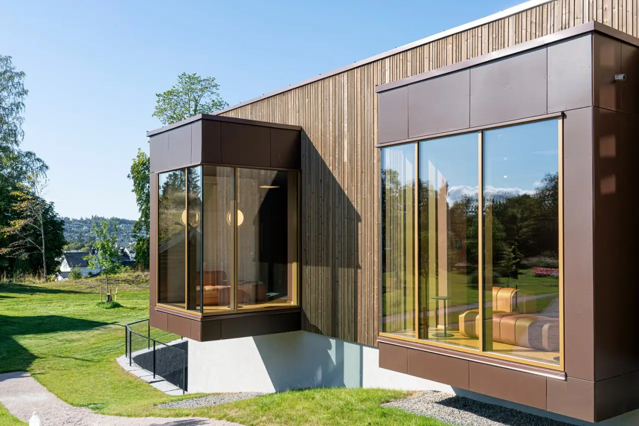 Nyt deilig bakst og en kopp kaffe fra kafeen, mens du tar en titt på Parklex Prodema sin ekte finerte bjørke fasade. Panelene er vedlikeholdsfrie, og holder fargen år etter år, uansett vær.