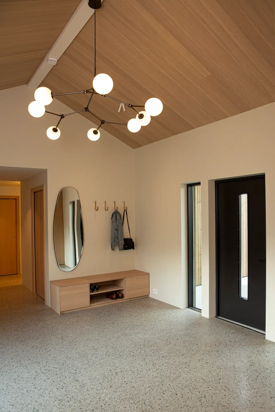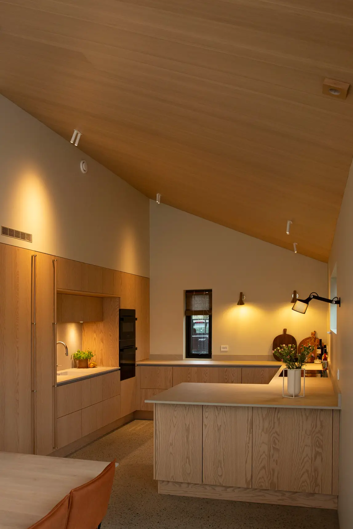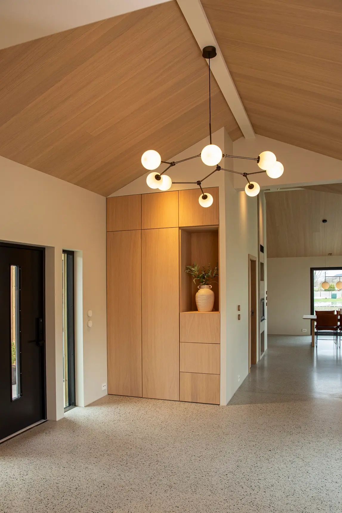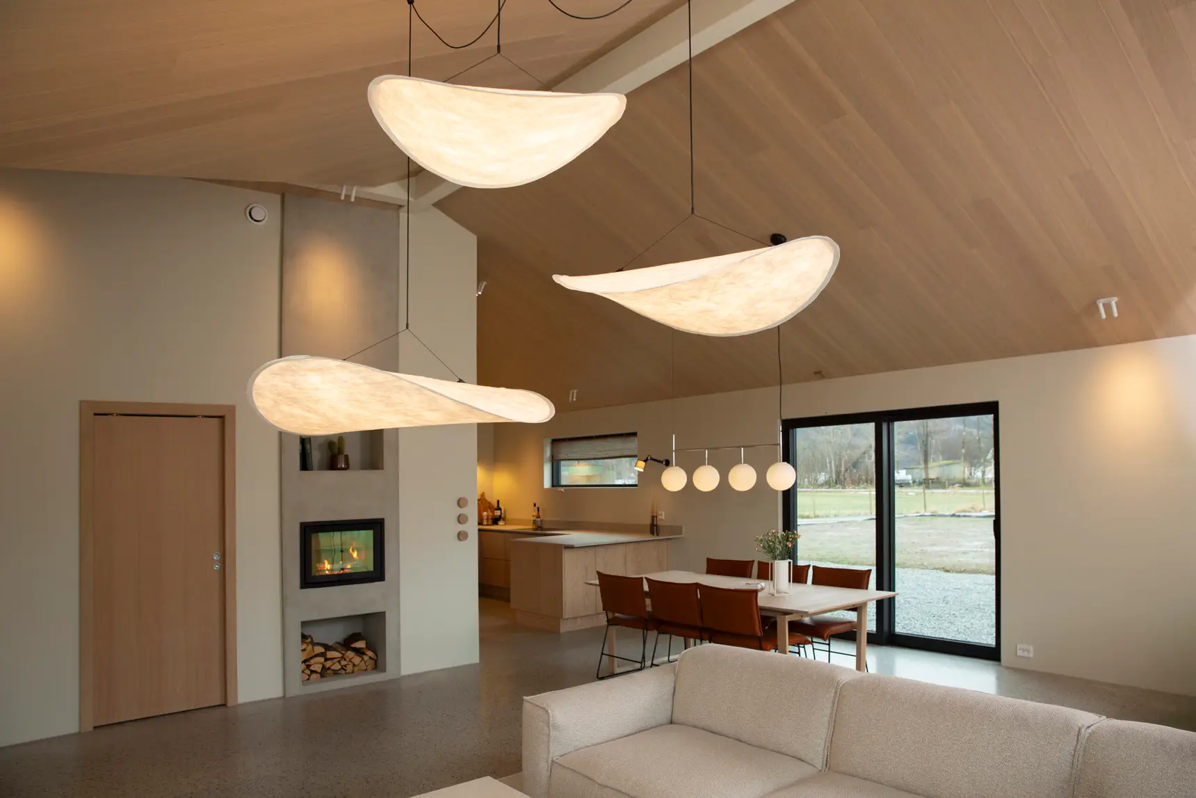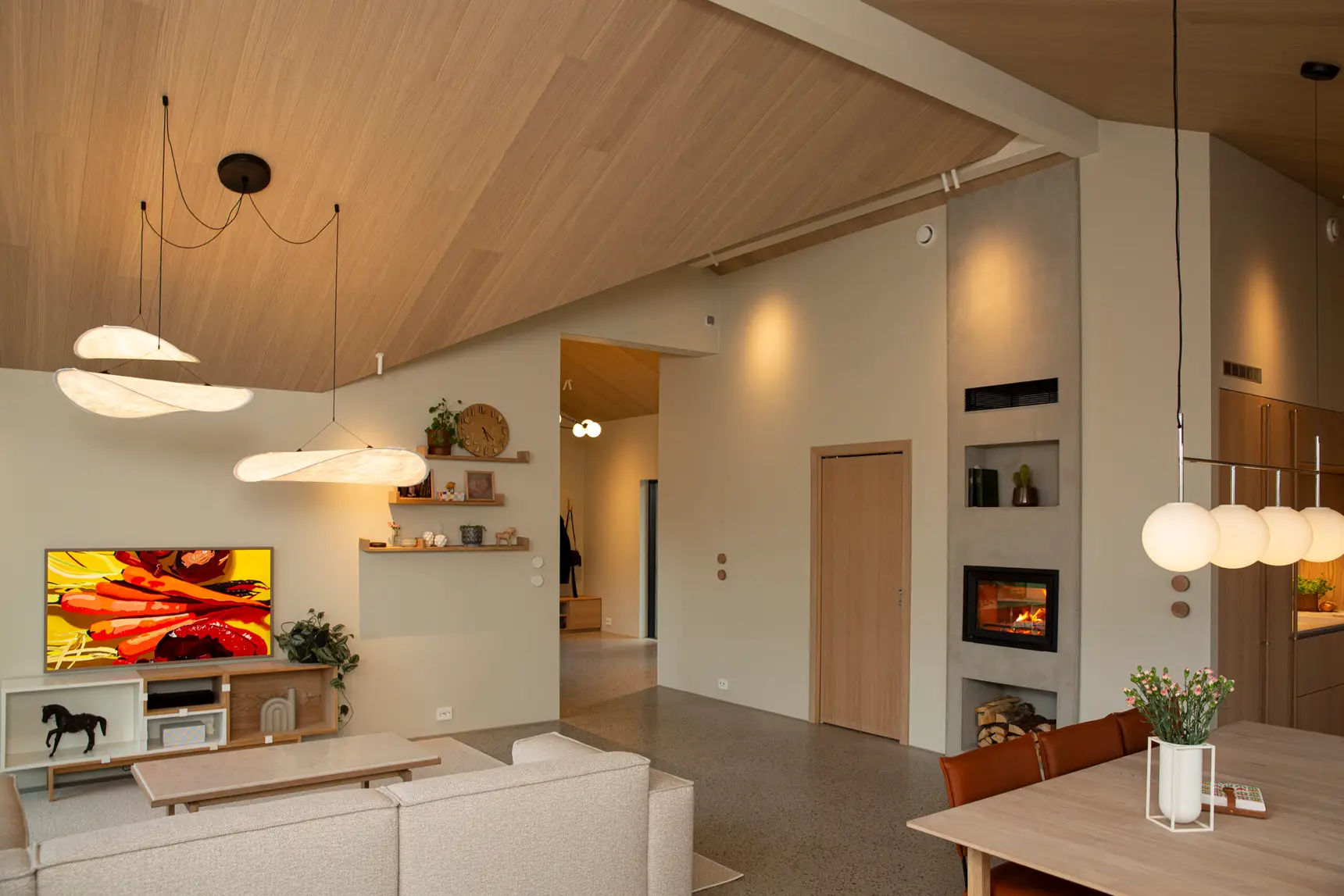 Huset er åpent med gang, stue, spisestue og kjøkken, så et grep for å ivareta god akustikk var veldig viktig for kunden. Det vakre taket var et perfekt sted å ta akustiske grep, samtidig som det gir rommet en lun følelse.
